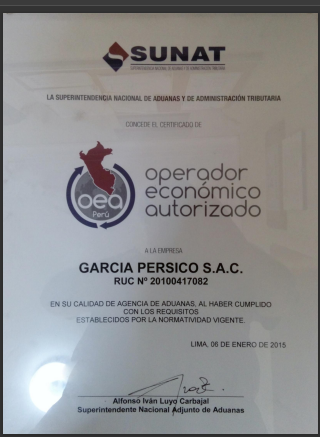 García Pérsico S.A.C. es una agencia fundada en 1969, con una larga trayectoria de seriedad, eficiencia y dedicación en la actividad aduanera. Nos complace informarles que, en relación con las exigencias de la Ley General de Aduanas referentes a infraestructura, tecnología y respaldo de capital social y patrimonial, nuestra agencia ha cumplido con todas ellas.